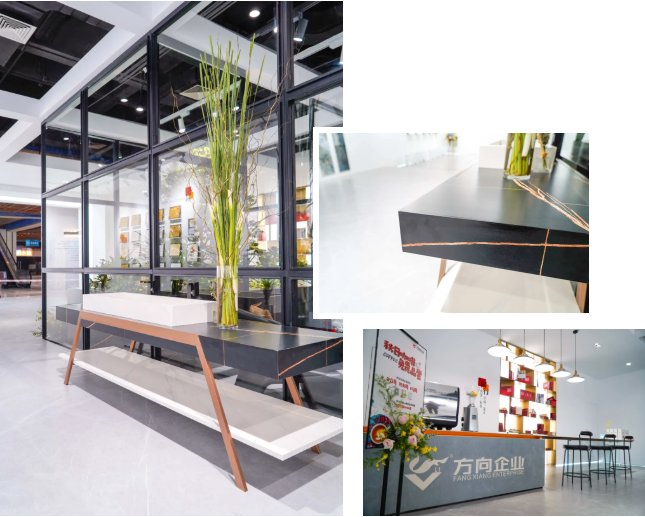 巖板定制也是方向企業幸福家居生活館中的一大亮點,打破家居場景的邊界,多角度演繹產品的藝術美學和無限創意,這不僅體現了公司在巖板領域的創新設計能力,也反映了公司在巖板應用加工領域的探索和研究。