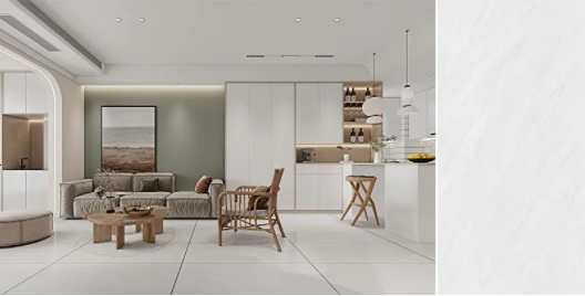 樓蘭灰,通透的理石紋磚面泛起粼粼波光,如同陽光照耀下的冰川般干凈純粹,在不動神色間展現(xiàn)出高貴精致的磅礴氣勢。