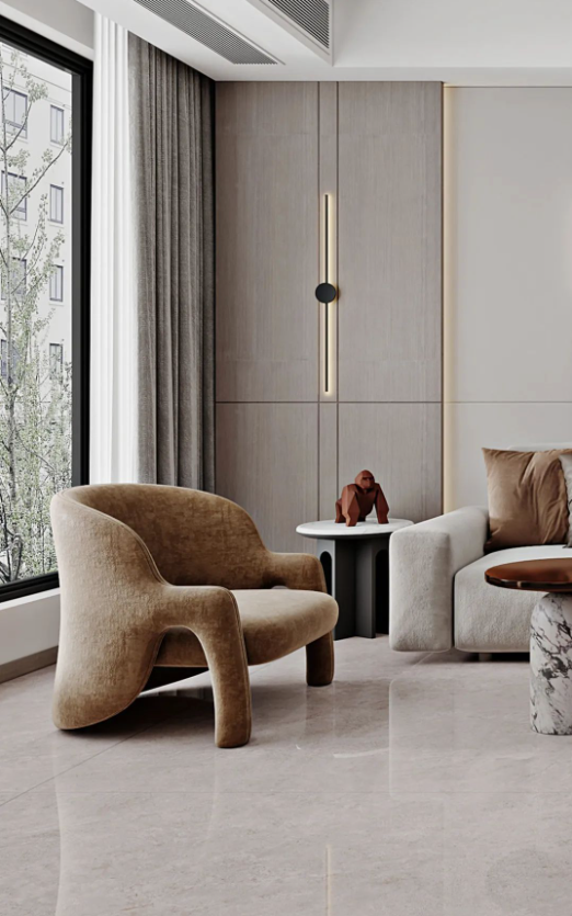 客廳采用挑高設計,不僅能增強室內(nèi)采光效果,同時突出空間錯落有致的層次感,讓客廳高級感瞬間拉滿,加上斯克深灰獨一無二的紋理,無論檔次、質(zhì)感、氣場,都透露著別具一格的藝術氛圍。